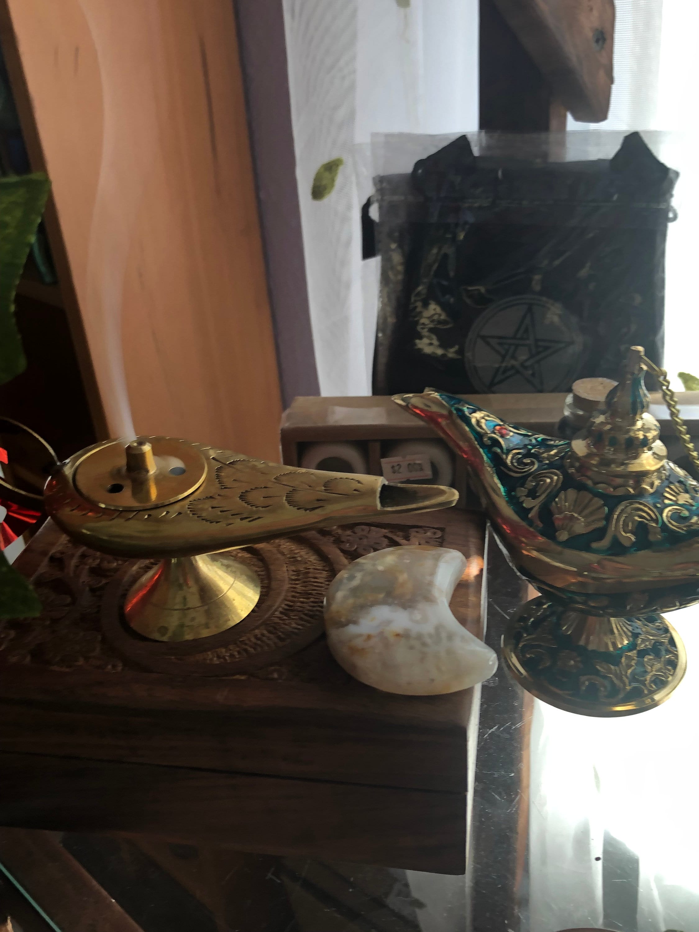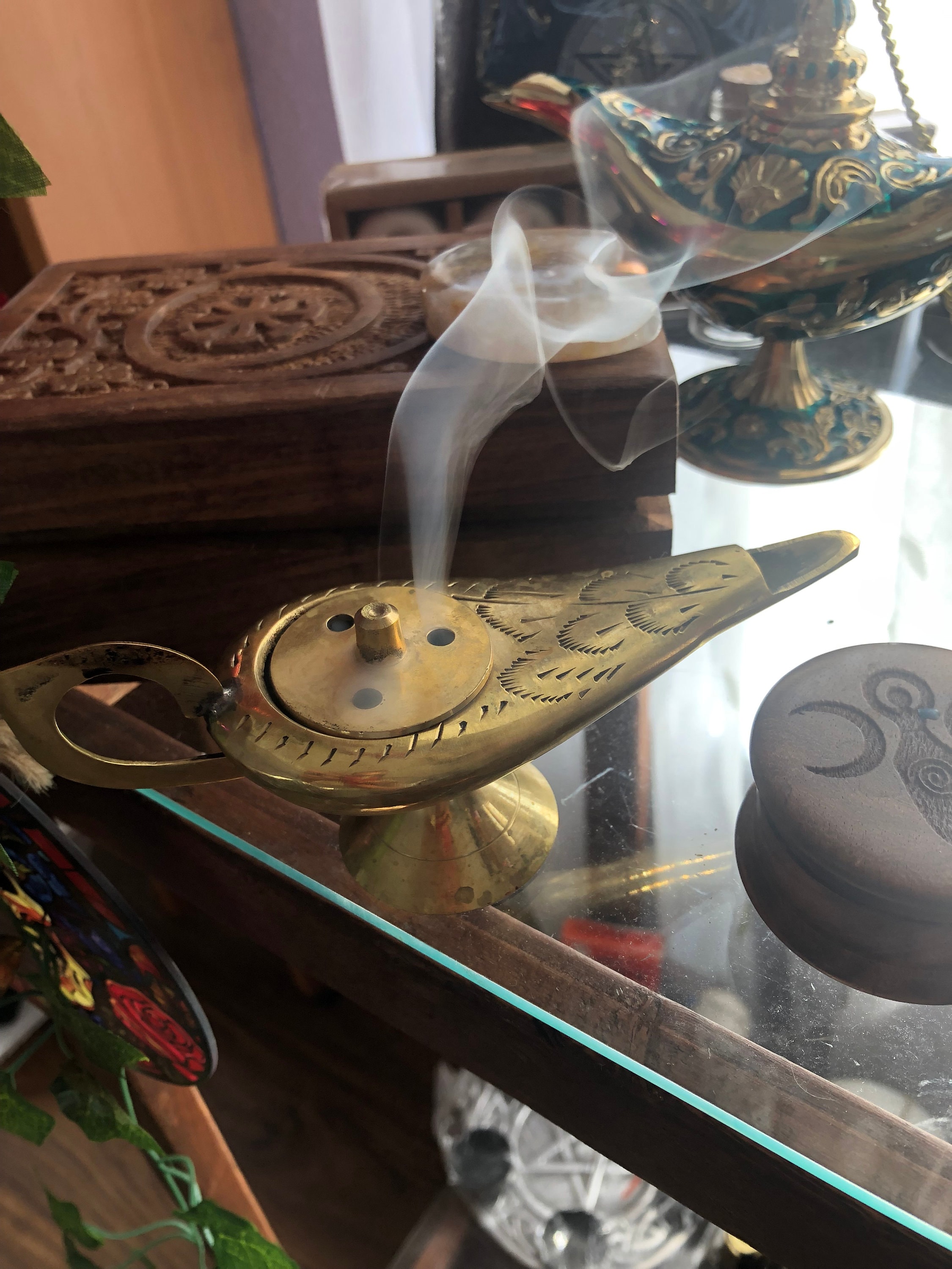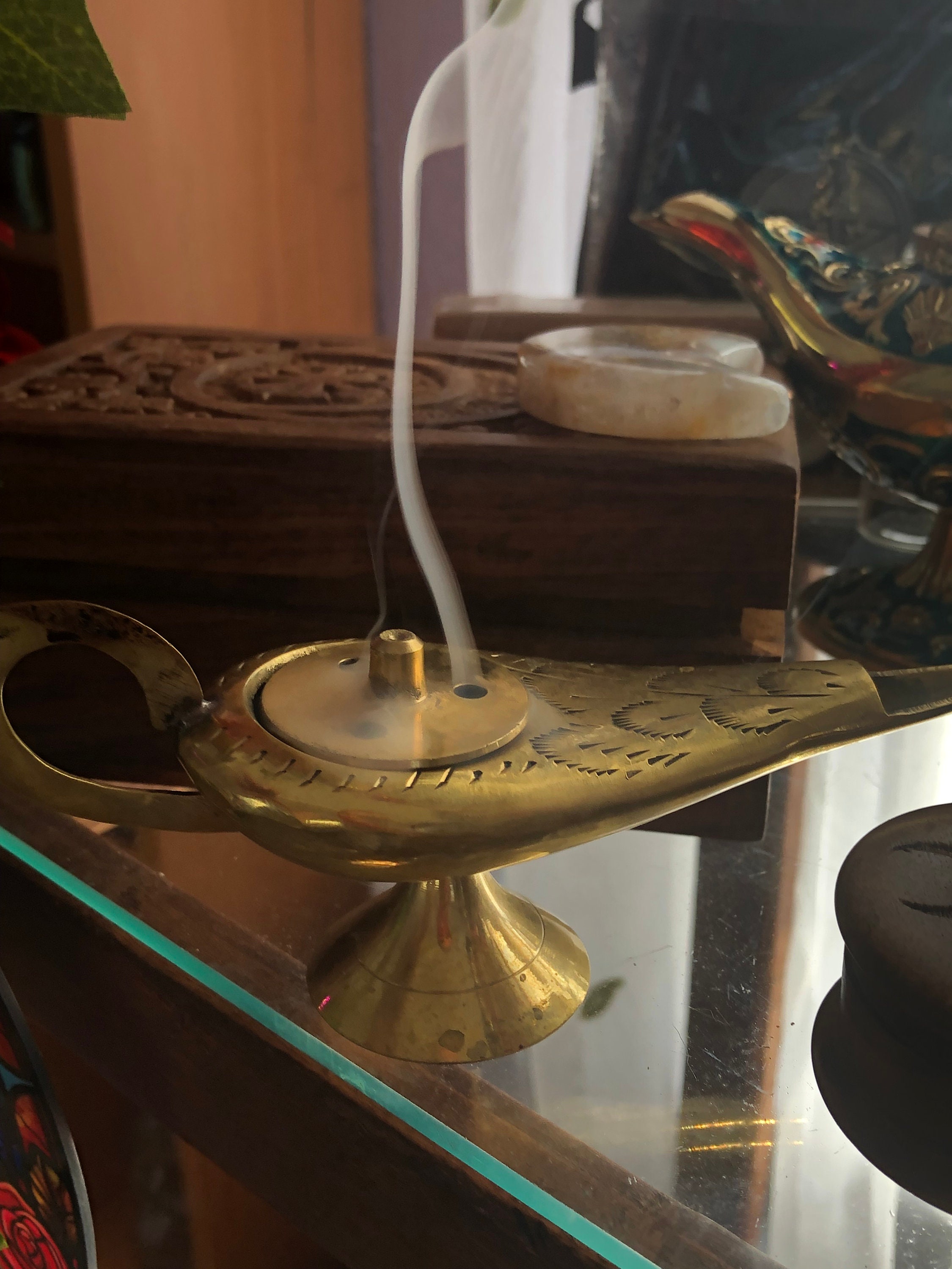 Djinn lamp can be used decoratively, as a spirit vessel, or as a incense burner.
