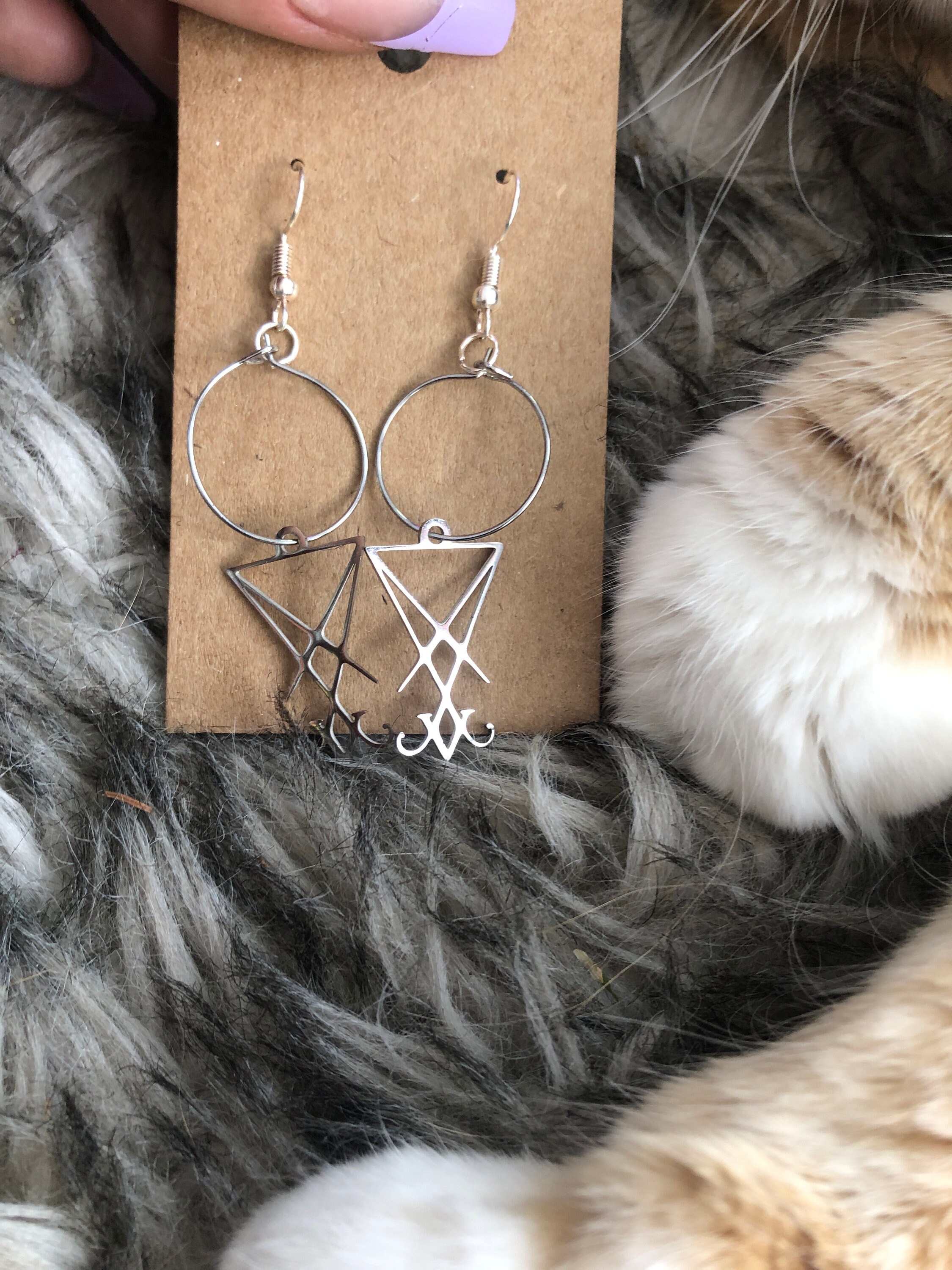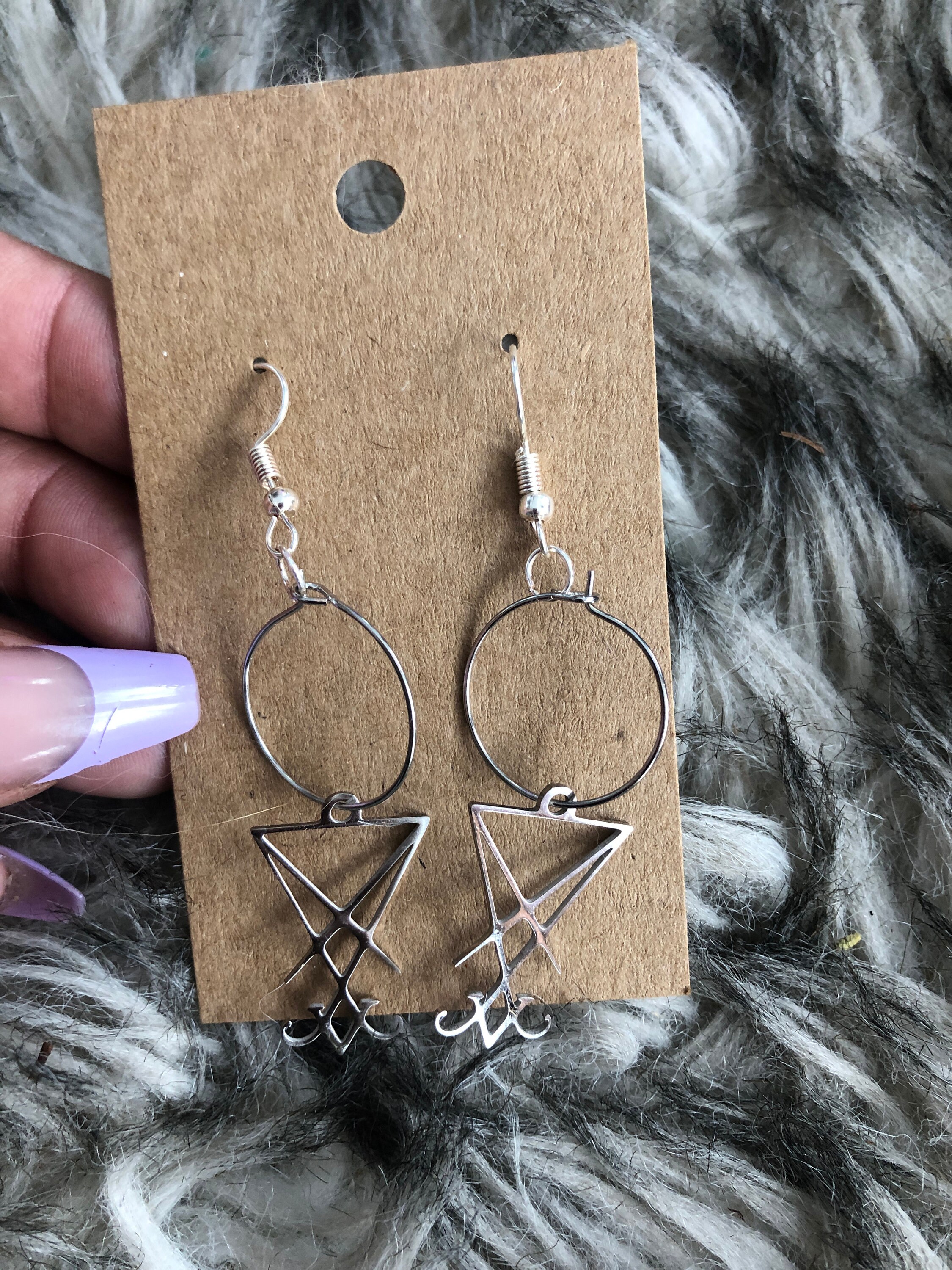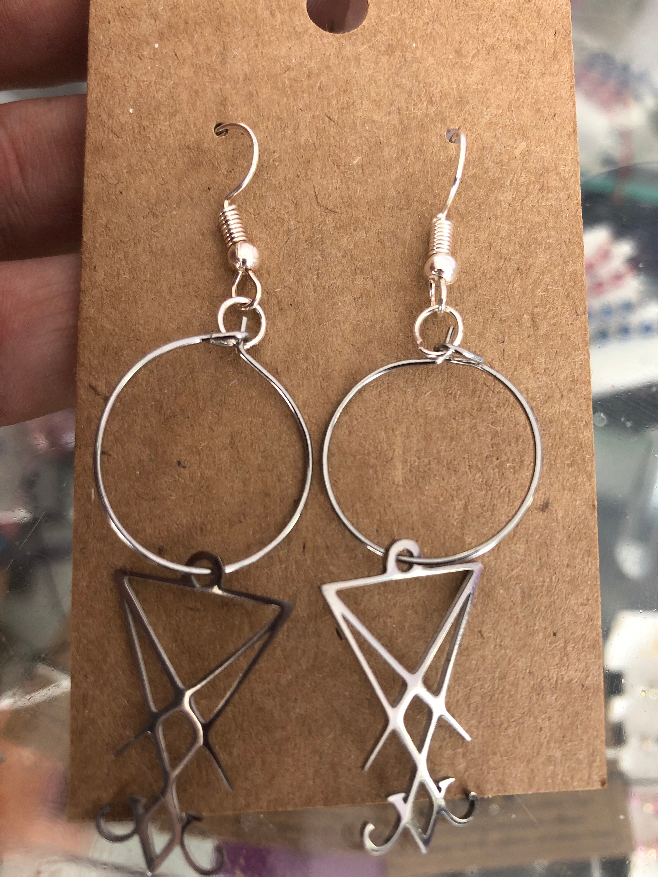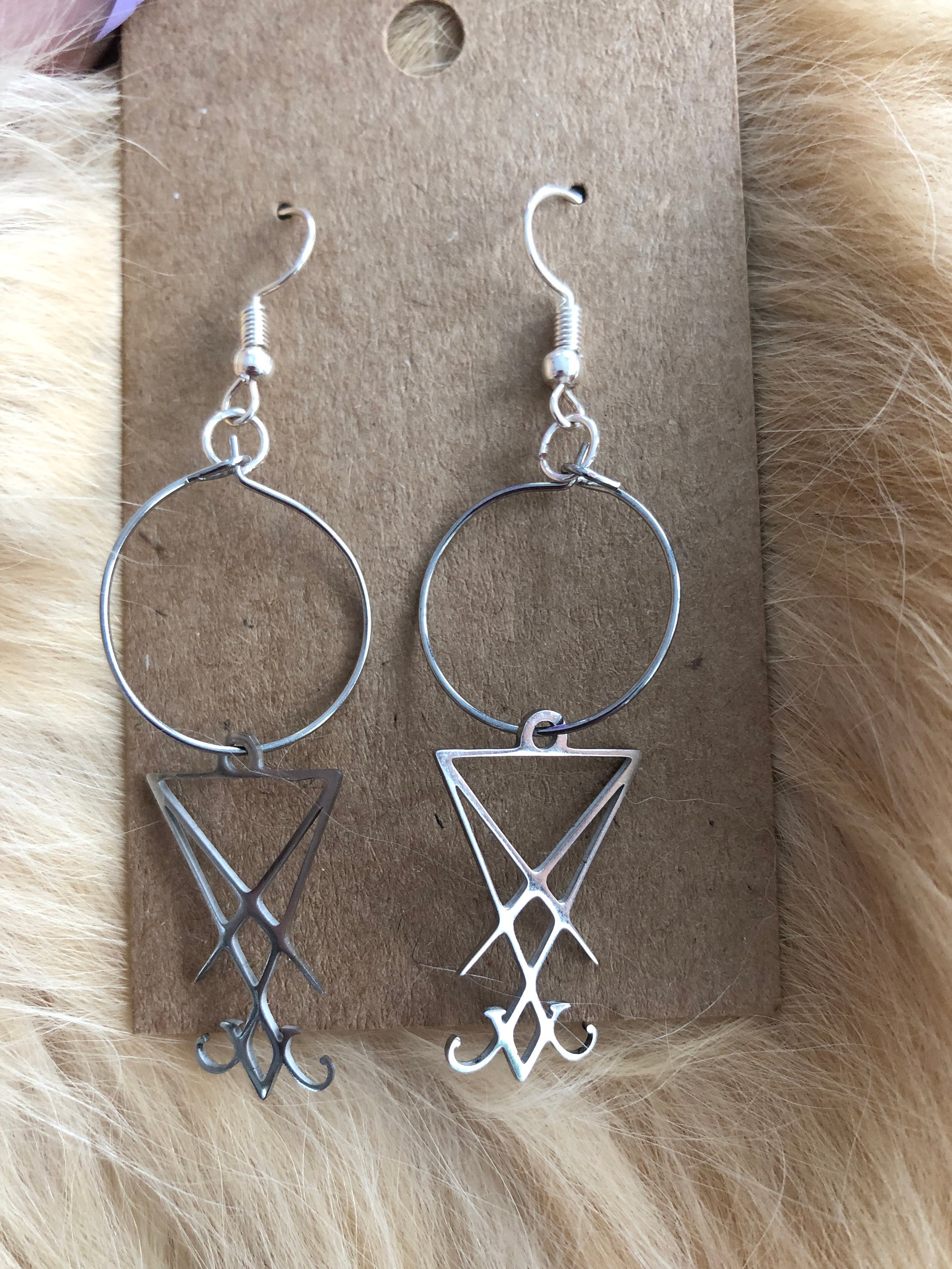 Beautiful stainless steel Lucifer sigil hoop earrings is on a sterling silver earring fish hook. blessed, and offered to Lucifer The light bearer.